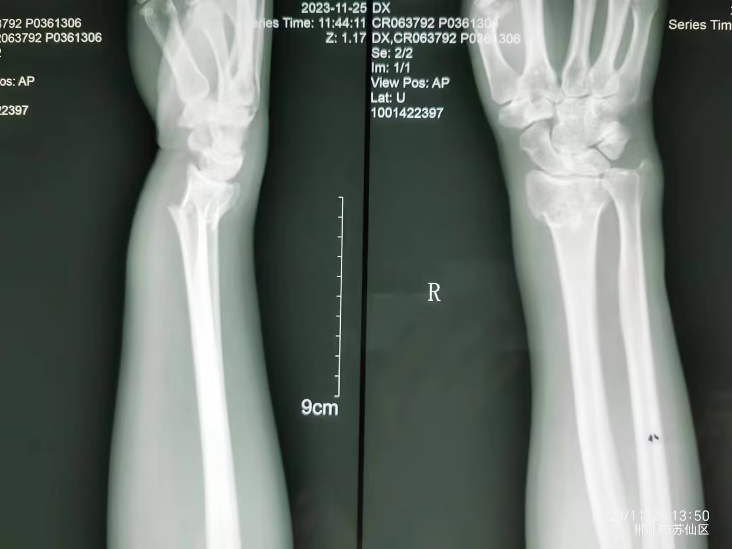 外伤后致右桡骨远端骨折(伸直型),急诊予手法复位+夹板外固定