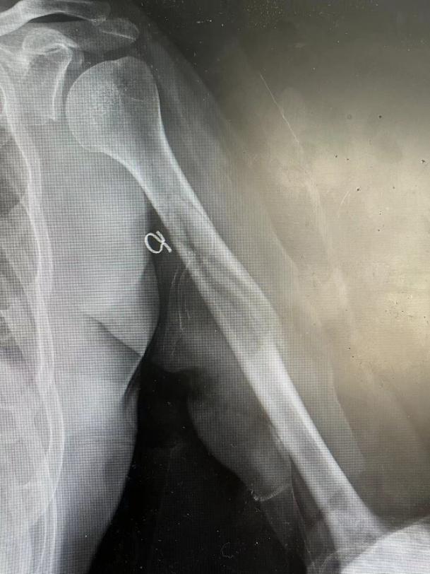 简要病史:跌倒致左上臂肿痛、活动受限2小时,就诊于我院,拍片诊断为左肱骨中段粉碎性骨折,患者家属强烈要求非手术治疗入住我科。